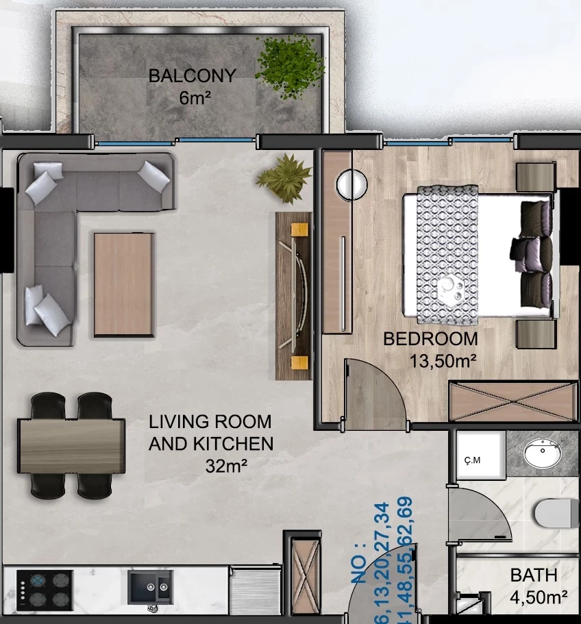 Wohnung zum Verkauf in Alanya. Fläche m²: 67, Zimmer: 1+1, Preis: 142 500 Euro. (ID 532)