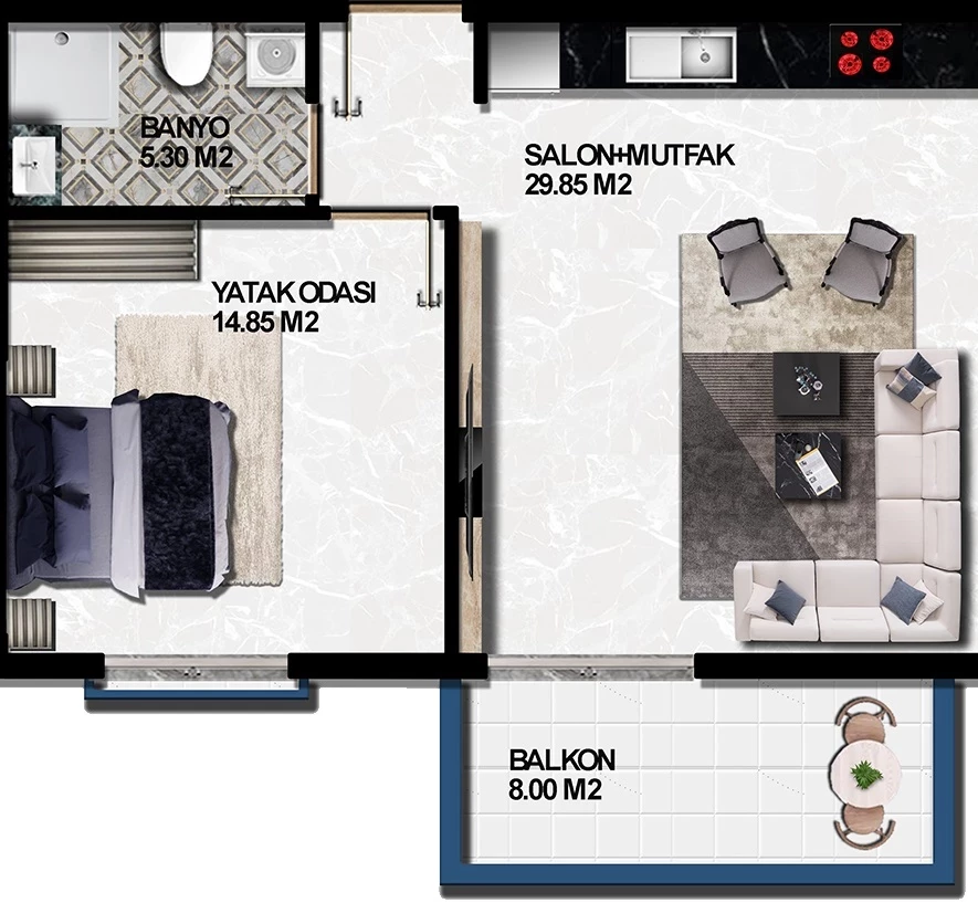 Wohnung zum Verkauf in Alanya. Fläche m²: 58, Zimmer: 1+1, Preis: 126 650 Euro. (ID 550)