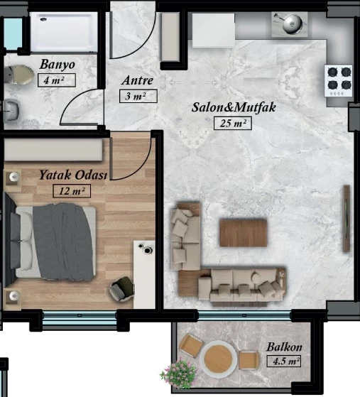 Wohnung zum Verkauf in Alanya. Fläche m²: 53, Zimmer: 1+1, Preis: 110 000 Euro. (ID 551)