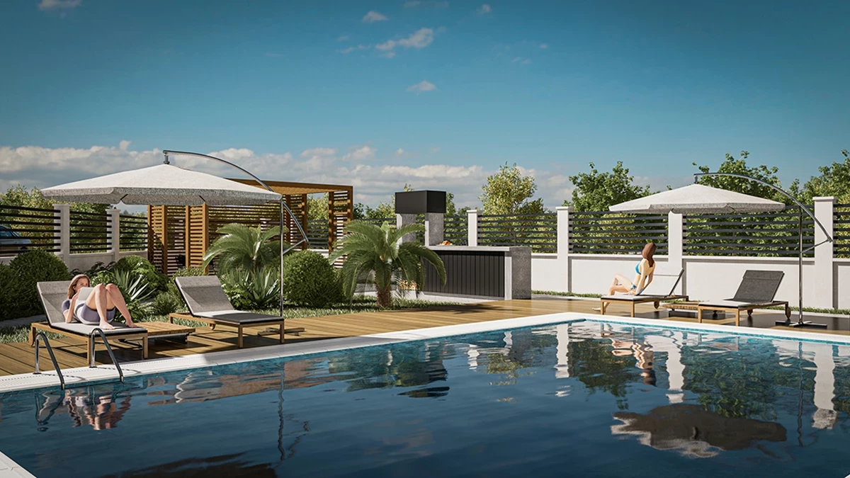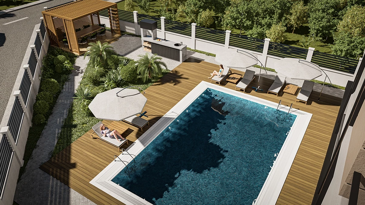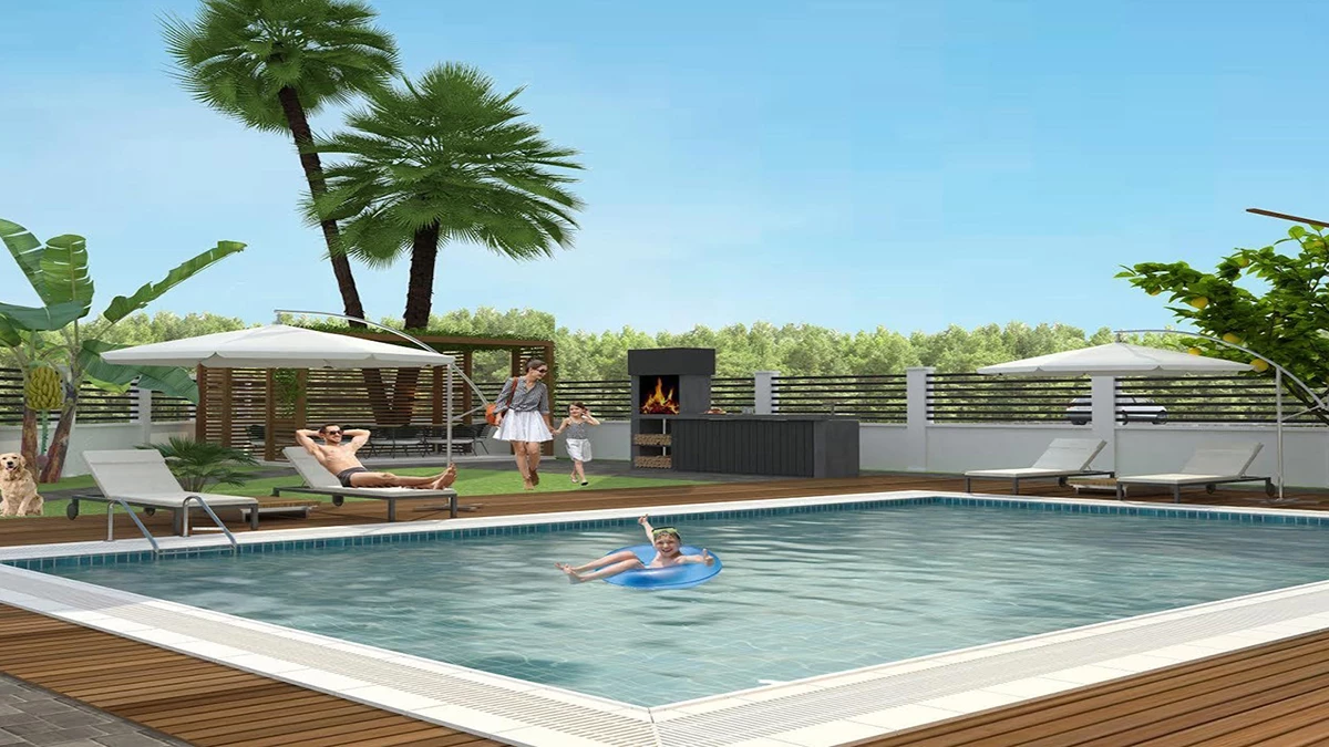 Ашық бассейн, Теңізге тегін тасымалдау, Спорт залы, фин саунасы, барбекю алаңы, Ойын алаңы, Жасыл аймақ, Автотұрақ, бейнебақылау камерасы, Күрделі қамқоршы