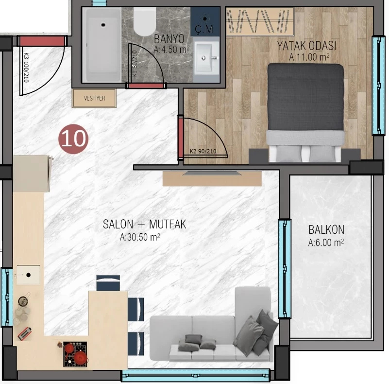 Продається квартира в Аланья. Площа, м: 56, кімнат: 1+1, ціна: 98 750 євро. (ID 585)